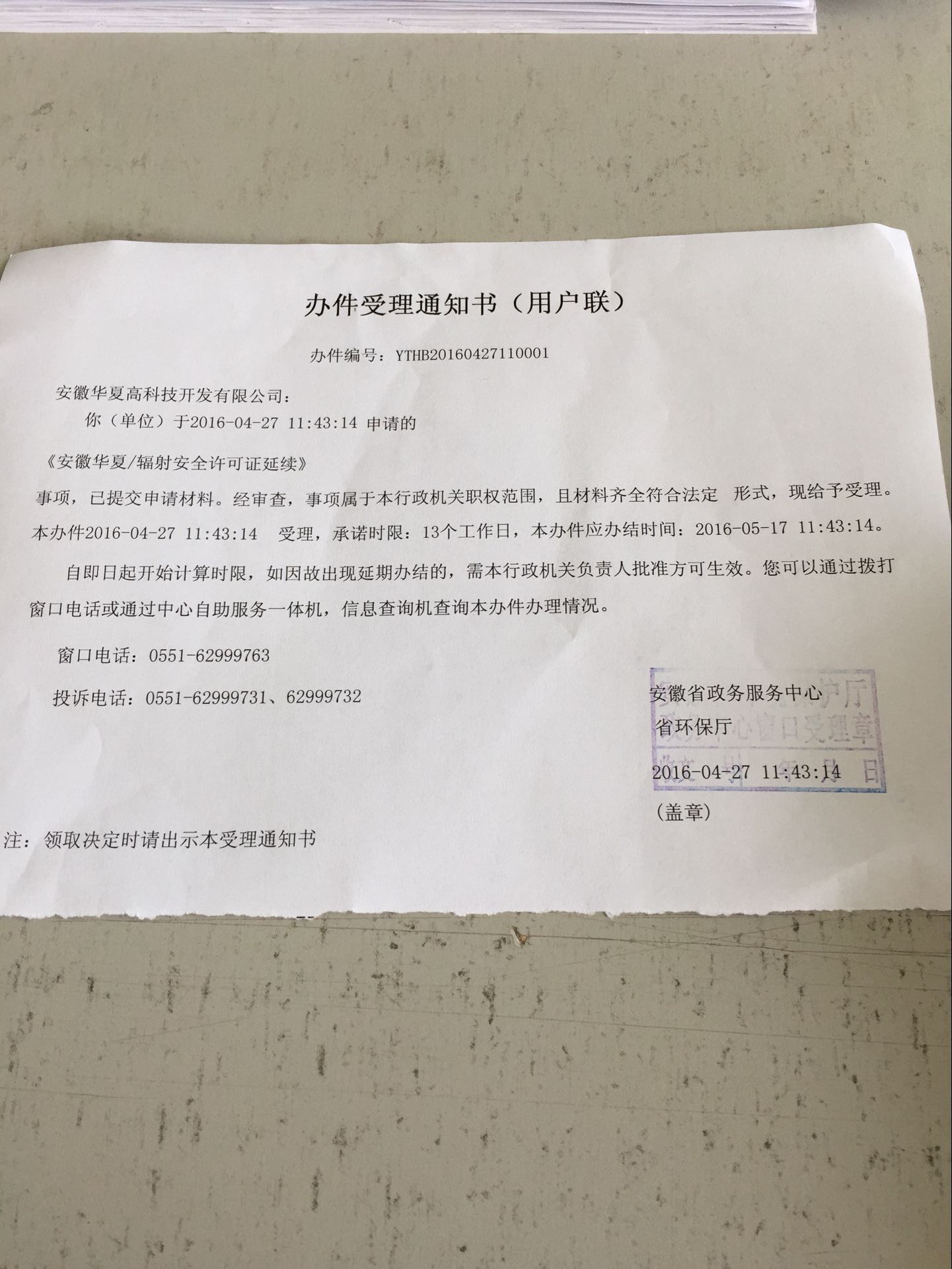 2016年輻射安全許可證延續(xù)申請(qǐng)受理通知書